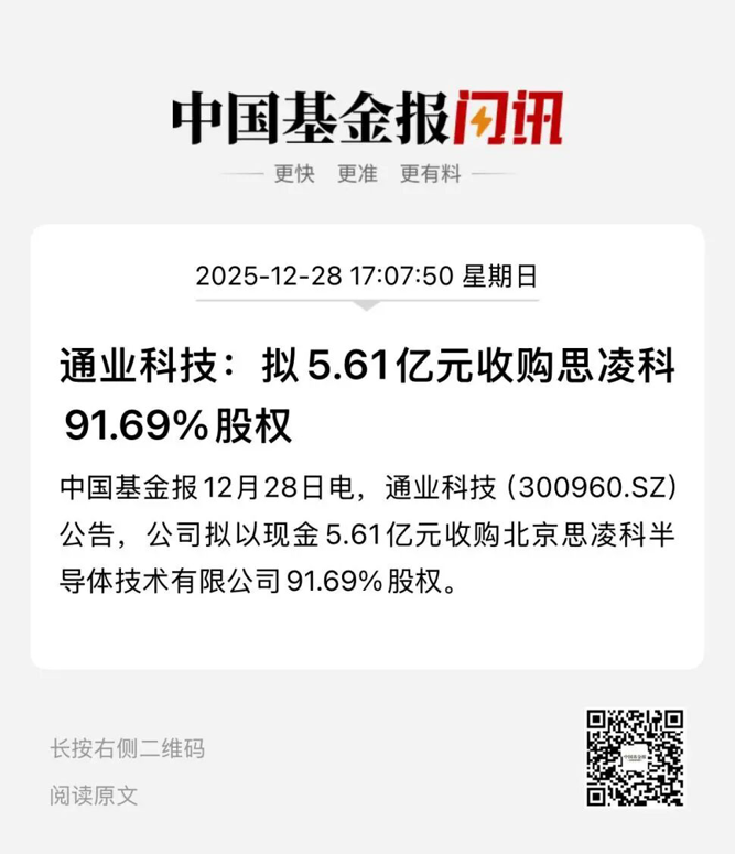 12月28日,通业科技发布公告称,公司拟现金收购北京思凌科半导体技术有限公司(以下简称思凌科半导体)91.69%股权,交易价格敲定5.61亿元。