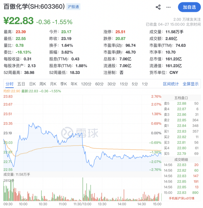 截至4月27日收盘,百傲化学股价报22.83元/股,总市值为161.23亿元。