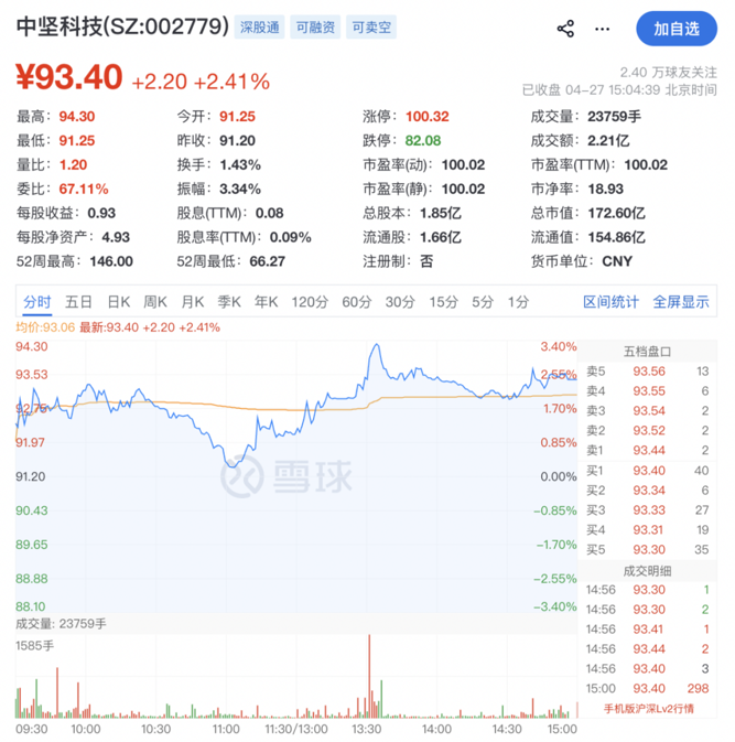 截至4月27日收盘,中坚科技股价报93.4元/股,总市值为172.6亿元。