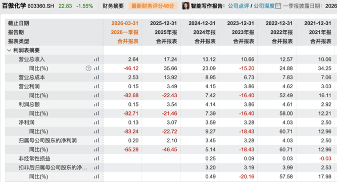 2026年一季度,百傲化学实现营收2.64亿元,同比下降46.12%;归母净利润为1982.85万元,同比下降65.28%。