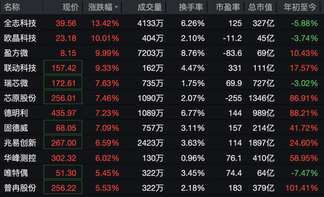 半导体板块表现活跃,存储芯片概念股快速拉升,全志科技涨超13%,欧晶科技、盈方微纷纷涨停。