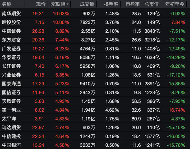 早盘大金融板块走高,券商股集体拉升,南华期货、哈投股份涨停,中信证券涨超7%,东方财富、广发证券、华泰证券等均涨超5%。