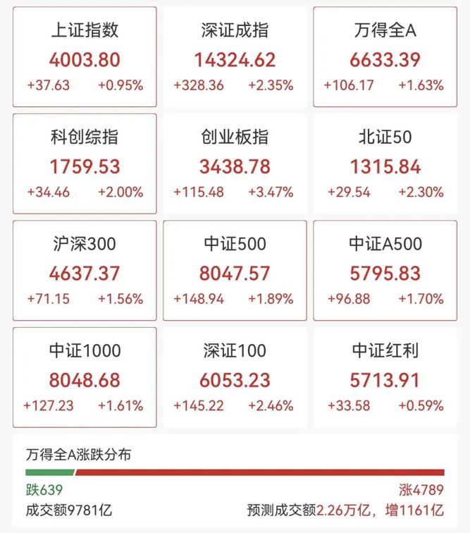 4月10日早盘,A股三大指数集体高开,指数快速走强,沪指时隔14个交易日重回4000点。截至发稿,沪指涨0.95%,深成指涨2.35%,创业板指涨3.47%,科创综指涨2.00%。