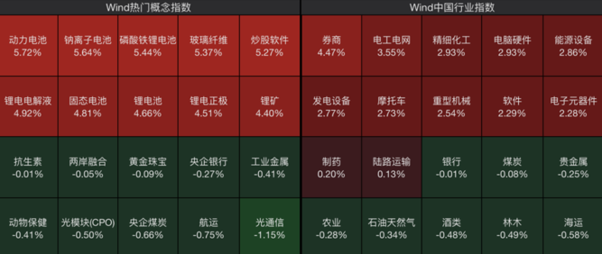 从板块上看,券商股强势走高,锂电、半导体、电工电网、能源设备等板块表现活跃;海运、白酒、CPO等板块震荡调整。沪深京三市上涨个股近4800只。