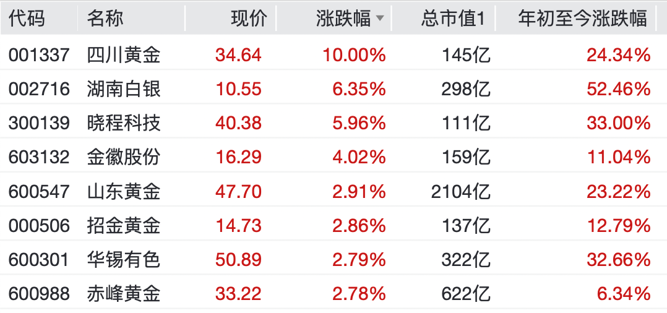 个股方面,四川黄金涨停,湖南白银、晓程科技、金徽股份、山东黄金等纷纷上涨。