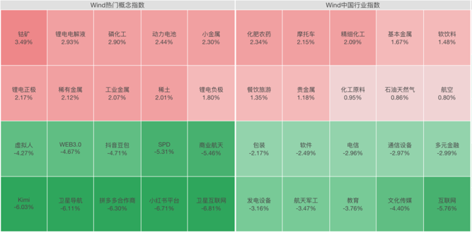 从板块看,贵金属、能源金属、电池等板块涨幅居前,商业航天、互联网服务、文化传媒等板块下挫。