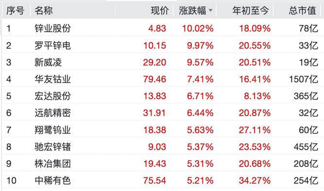 个股方面,锌业股份、罗平锌电双双涨停,新威凌上涨近10%,远航精密、宏达股份、翔鹭钨业、株冶集团涨超5%。