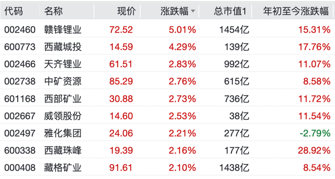 个股方面,华友钴业涨超7%,赣锋锂业涨超5%,盐湖股份、藏格矿业、天齐锂业纷纷上涨。