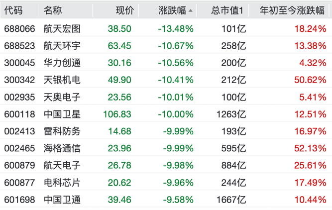 个股方面,中国卫星、雷科防务、海格通信、航天电子、电科芯片等纷纷跌停,航天宏图、航天环宇、华力创通、天银机电等跌超10%。