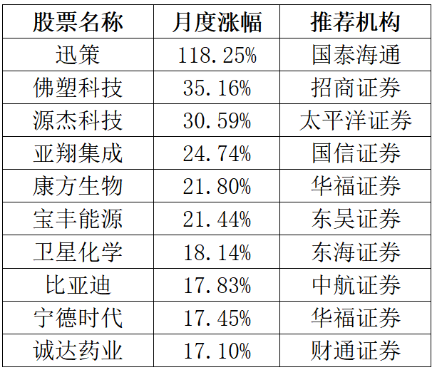 此外,国信证券推荐的亚翔集成、华福证券推荐的康方生物、东吴证券推荐的宝丰能源等个股同样表现不俗,月涨幅均超20%。宁德时代、比亚迪等行业龙头也实现稳健上涨,分别录得17.45%、17.83%的月度收益。
