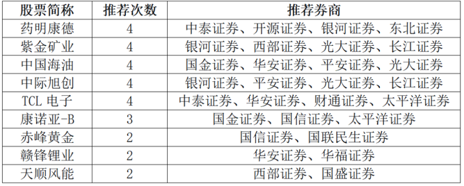 据统计,4月共有5只个股获得4家及以上券商共同推荐,分别为药明康德、紫金矿业、中国海油、中际旭创、TCL电子。