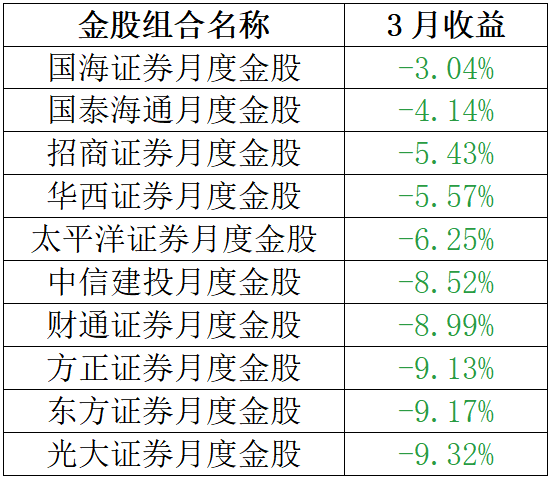 3月A股震荡调整,沪深300指数单月下跌5.53%。在此背景下,各大券商金股组合悉数下跌,国海证券、国泰海通、招商证券等金股组合跌幅相对较小。