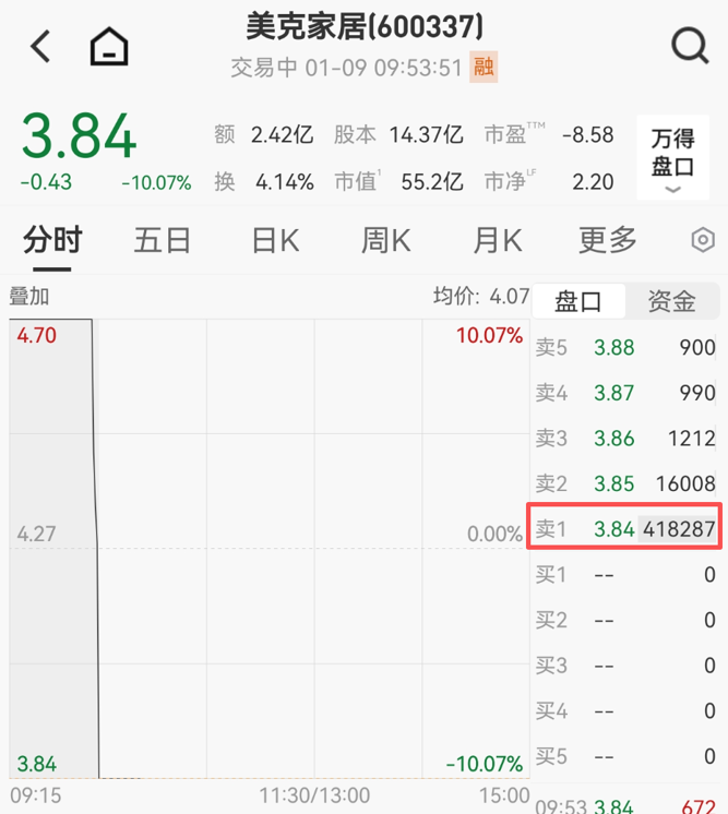 1月9日,美克家居开盘大跳水,1分钟封死跌停。截至发稿,美克家居报3.84元/股,跌幅为10.07%,卖一超41万手。