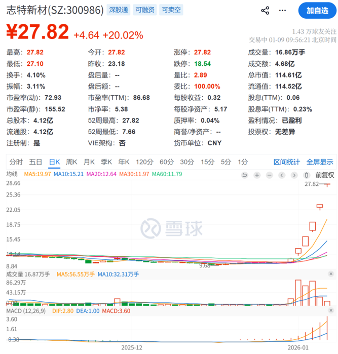 1月9日,志特新材在竞价阶段即涨停,报27.82元/股,涨幅为20.02%。截至发稿,志特新材仍保持20cm涨停状态,实现5连板。
