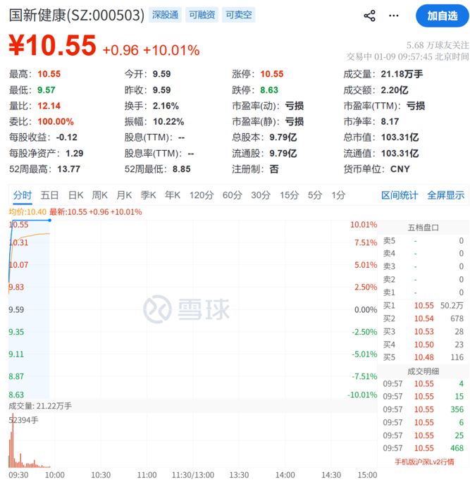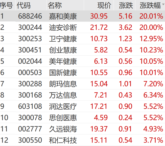 个股方面,迪安诊断、嘉和美康20cm涨停,卫宁健康、创业慧康等涨超10%,国新健康、美年健康直线拉涨停。