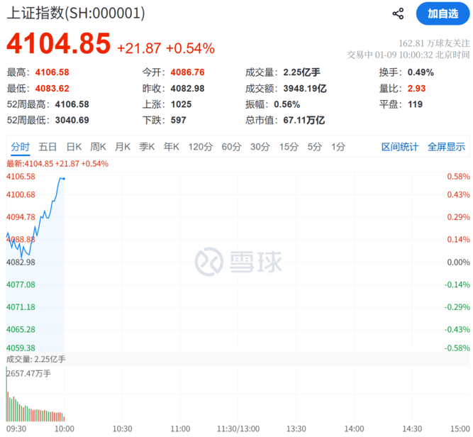 1月9日,A股三大指数开盘涨跌不一:沪指微涨0.09%,深成指跌0.3%,创业板指跌0.69%。开盘后市场震荡拉升,截至发稿,沪指成功站上4100点,A股主要指数集体飘红。