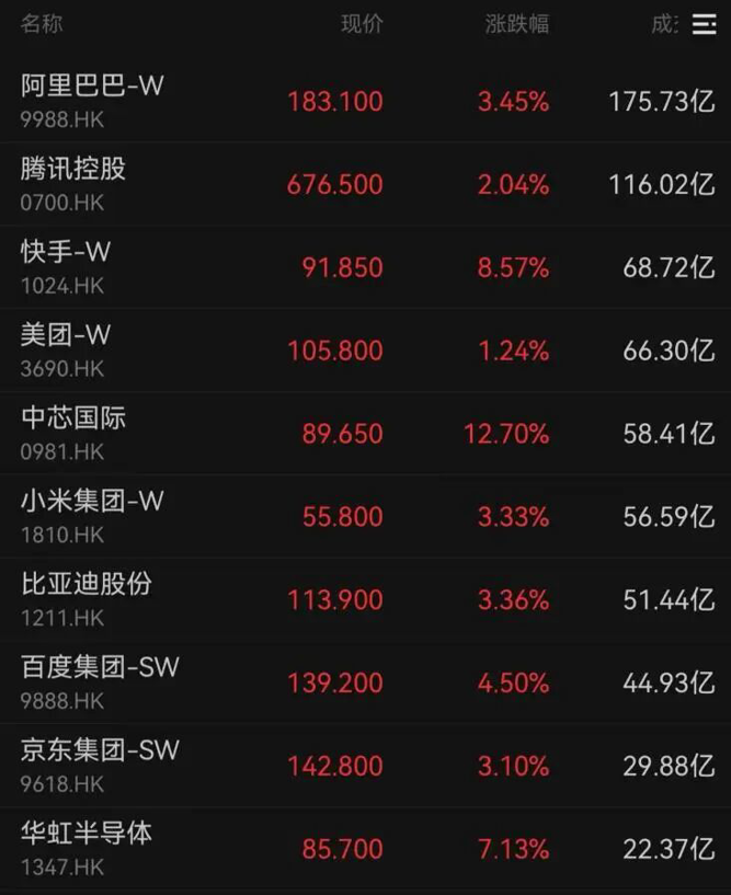 港股科技巨头表现强劲。快手大涨8.57%,阿里巴巴、腾讯控股成交额分别为约176亿、116亿港元,分别上涨3.45%、2.04%。