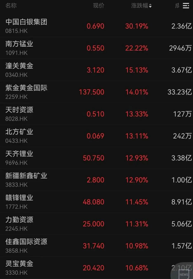 中国白银集团涨超30%,潼关黄金、紫金黄金国际分别上涨15.13%、14.01%。有色板块同样受提振,“锂电双雄”天齐锂业、赣锋锂业均涨超10%