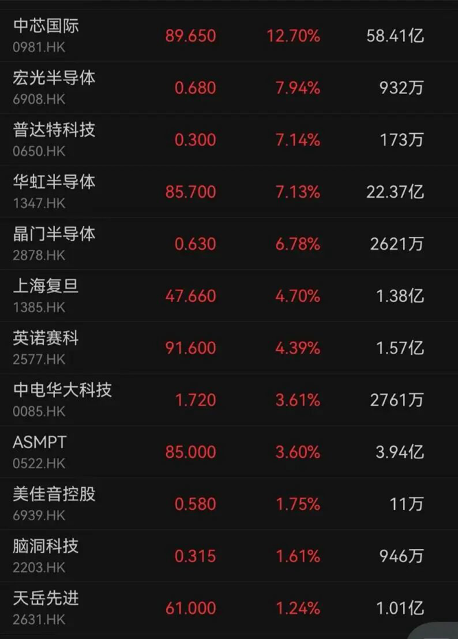 “芯片股三巨头”中芯国际、华虹半导体、上海复旦分别上涨12.70%、7.13%、4.70%。中芯国际今日成交额达到58亿港元。
