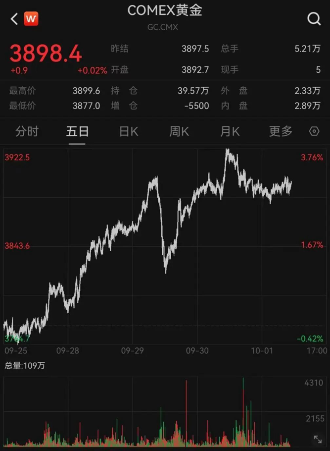 近日美国政府停摆,引发避险需求。美联储降息预期提升也推动黄金价格持续上行。