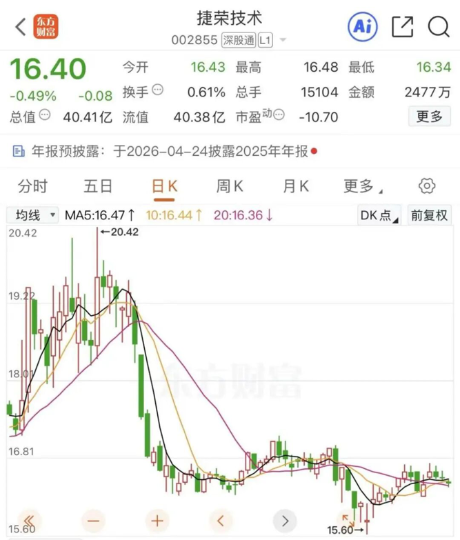 截至2月27日收盘,捷荣技术报收16.40元/股,最新市值为40.41亿元。