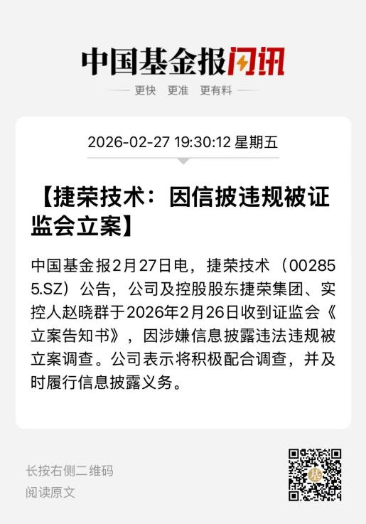 2月27日,捷荣技术公告称,公司控股股东捷荣科技集团有限公司(以下简称捷荣集团)及实际控制人赵晓群,于2026年2月26日收到中国证监会出具的《立案告知书》。因涉嫌信息披露违法违规,中国证监会决定对公司、捷荣集团及赵晓群立案。