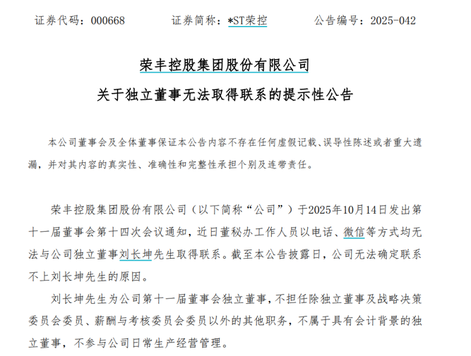 *ST荣控称,公司于2025年10月14日发出第十一届董事会第十四次会议通知,近日董秘办工作人员以电话、微信等方式均无法与公司独立董事刘长坤取得联系。截至公告披露日,公司无法确定联系不上刘长坤的原因。