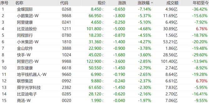 恒生科技指数成份股中,4只上涨,53只下跌。金蝶国际跌7.14%,小鹏集团跌5.37%,阿里健康跌5.10%。