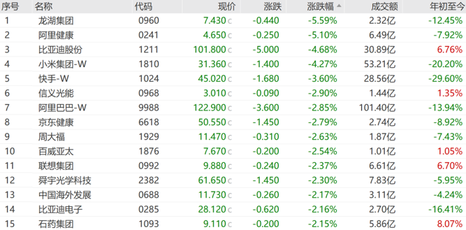 恒生指数成份股中,36只上涨,53只下跌。龙湖集团跌5.59%,阿里健康跌5.10%,比亚迪股份跌4.68%,领跌蓝筹。