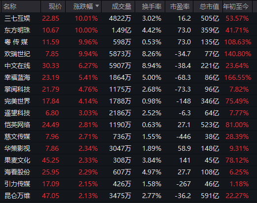 短剧游戏概念股快速拉升,三七互娱、东方明珠、欢瑞世纪、粤传媒等多股涨停,中文在线、幸福蓝海、掌阅科技等跟涨。