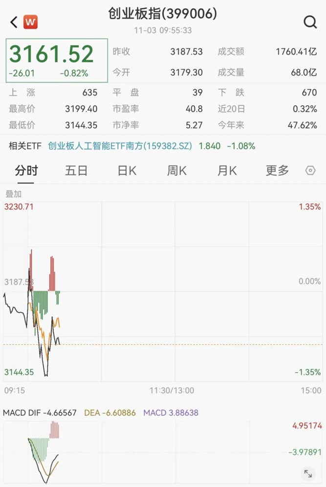 11月3日开盘,A股市场震荡调整,创业板指一度跌逾1%。