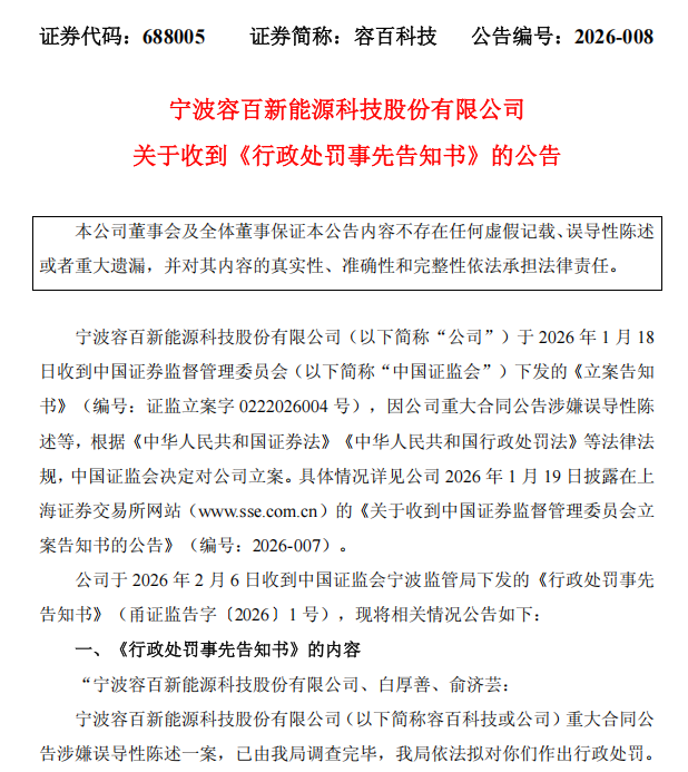 2月6日晚间,容百科技发布公告称,公司重大合同公告涉嫌误导性陈述一案,已由宁波证监局调查完毕。宁波证监局依法拟对公司及相关人员作出行政处罚。