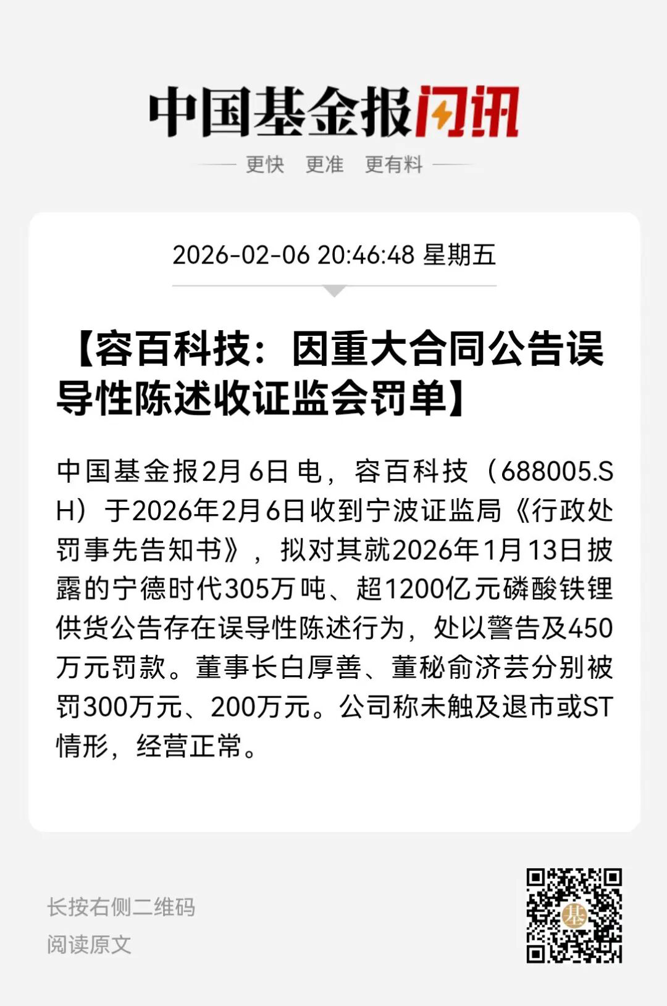 2月6日,容百科技收到宁波证监局下发的《行政处罚事先告知书》显示,容百科技1月13日晚间发布的《关于与宁德时代签署日常经营重大合同的公告》,未能真实、准确、完整地反映合作协议的实际条款内容,主要包含四点: