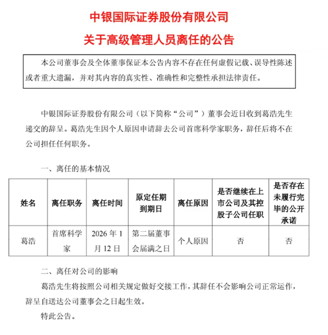 1月13日,中银证券发布公告,原首席科学家葛浩因个人原因辞职,辞任后将不在公司担任任何职务。