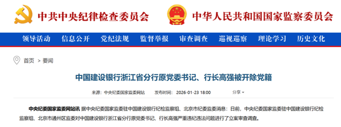 1月23日,中央纪委国家监委官网通报:中国建设银行浙江省分行原党委书记、行长高强被开除党籍。