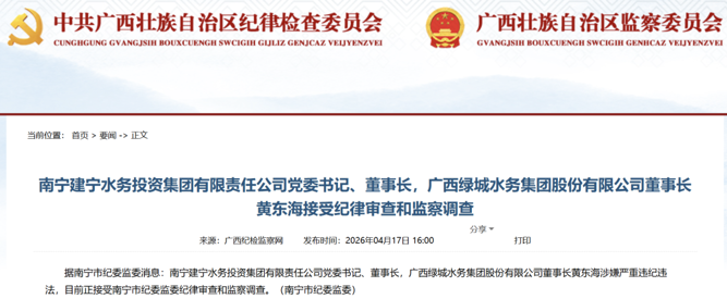 4月17日,广西纪检监察网通报:南宁建宁水务投资集团有限责任公司党委书记、董事长,广西绿城水务集团股份有限公司董事长黄东海涉嫌严重违纪违法,目前正接受南宁市纪委监委纪律审查和监察调查。
