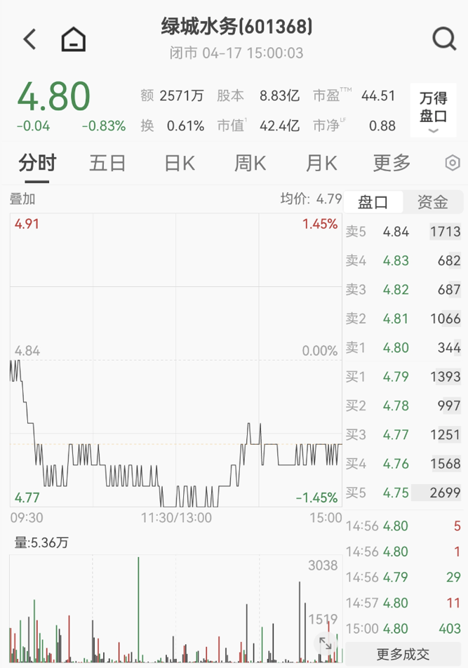 绿城水务于2015年6月12日在上海证券交易所挂牌上市。截至4月17日收盘,绿城水务报4.8元/股,当日跌幅为0.83%,总市值为42.4亿元。