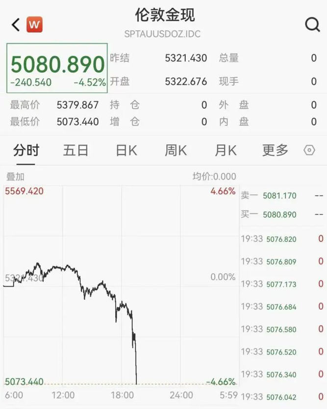 【导读】现货金银大跳水!现货黄金短线跳水300美元,失守5080美元/盎司