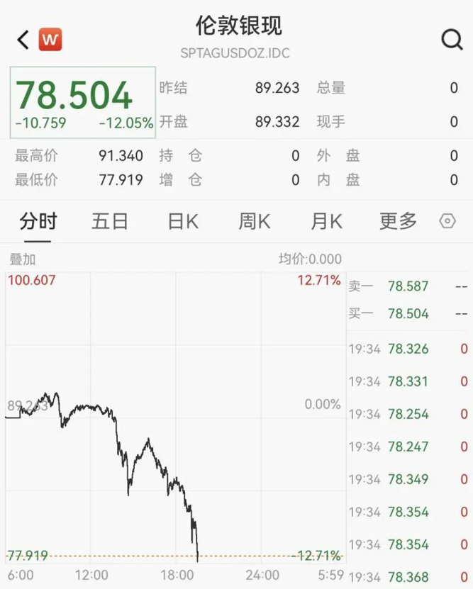 同时,现货白银日内大跌超12%,一度失守78美元/盎司,现报78.504美元/盎司。