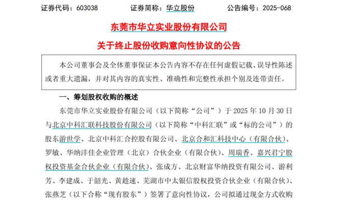 历时两个月,因交易各方未就核心条款达成共识,华立股份终止收购北京中科汇联科技股份有限公司(以下简称中科汇联)51%的股份。