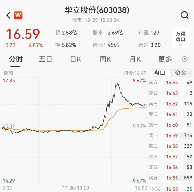 12月29日,华立股份股价曾一度冲高,截至收盘,该股报16.59元/股,总市值为45亿元。