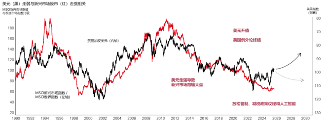 业内人士指出,在“美国例外论”受到挑战和美国进入降息周期的双重催化下,美元未来或仍将走弱。而美元走弱往往成为新兴市场表现的正向催化剂。历史上,美元疲软阶段,新兴市场股市的表现常常跑赢成熟市场。随着投资者对美国财政赤字的担忧升温,全球资金正从美元资产转移阵地,重新流向包括亚洲在内的新兴经济体。
