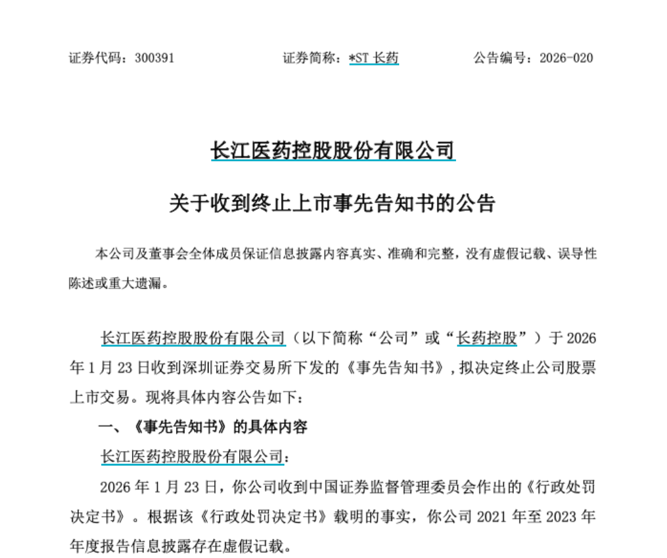 1月23日晚间,*ST长药财务造假处罚落地。因连续三年财务造假,公司被罚款1000万元。同时,深交所拟决定终止公司股票上市交易,公司股票自下周一开市起停牌。
