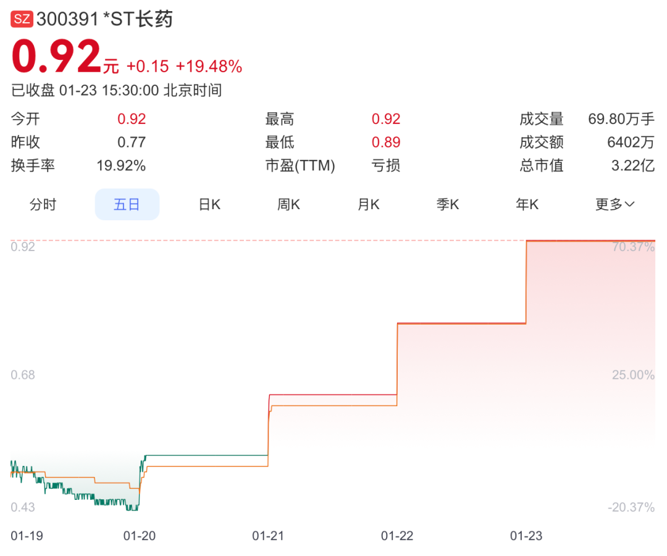 截至1月23日收盘,*ST长药报0.92元/股,总市值为3.22亿元。
