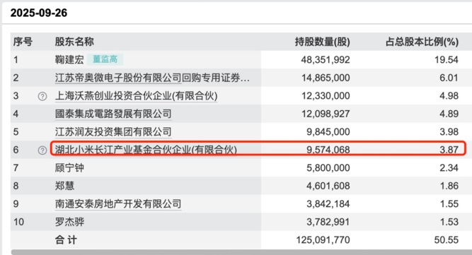 值得一提的是,此次交易收购方的帝奥微也与小米长江有着紧密联系,小米长江曾是其持股5%以上股东。截至2025年9月26日,小米长江直接持有帝奥微3.87%的股份。