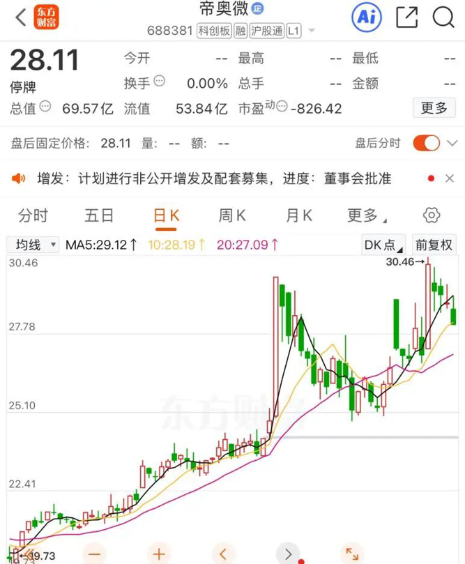 停牌前最后一个交易日(9月30日),帝奥微报收于28.11元/股,市值为69.57亿元。