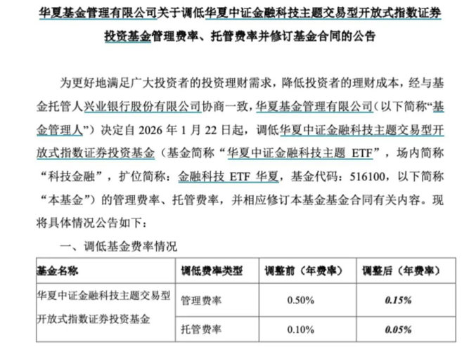 日前,华夏基金发布公告称,为了更好地服务广大投资者,降低投资者的理财成本,自2026年1月22日起,调低金融科技ETF华夏的管理费率、托管费率,并相应修改基金合同有关内容。其中,管理费率年费率由0.50%下调至0.15%,托管费率年费率由0.10%下调至0.05%,两项费率调降幅度分别达到70%和50%。