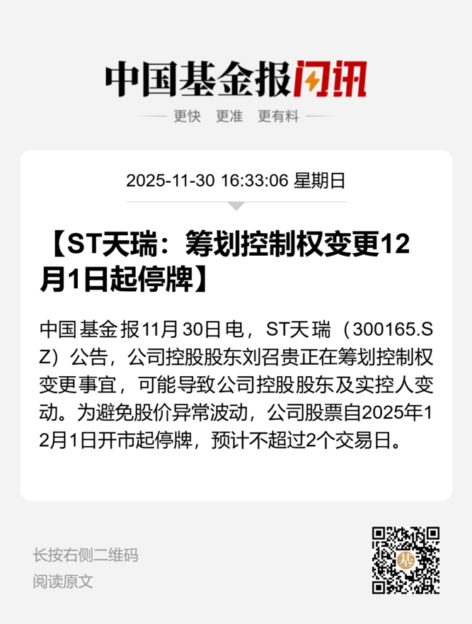 鉴于上述事项尚存在重大不确定性,根据《深圳证券交易所上市公司自律监管指引第6号——停复牌》相关规定,经ST天瑞向深圳证券交易所申请,公司股票(股票简称:ST天瑞,股票代码:300165)自2025年12月1日(星期一)开市起停牌,预计停牌时间不超过2个交易日。