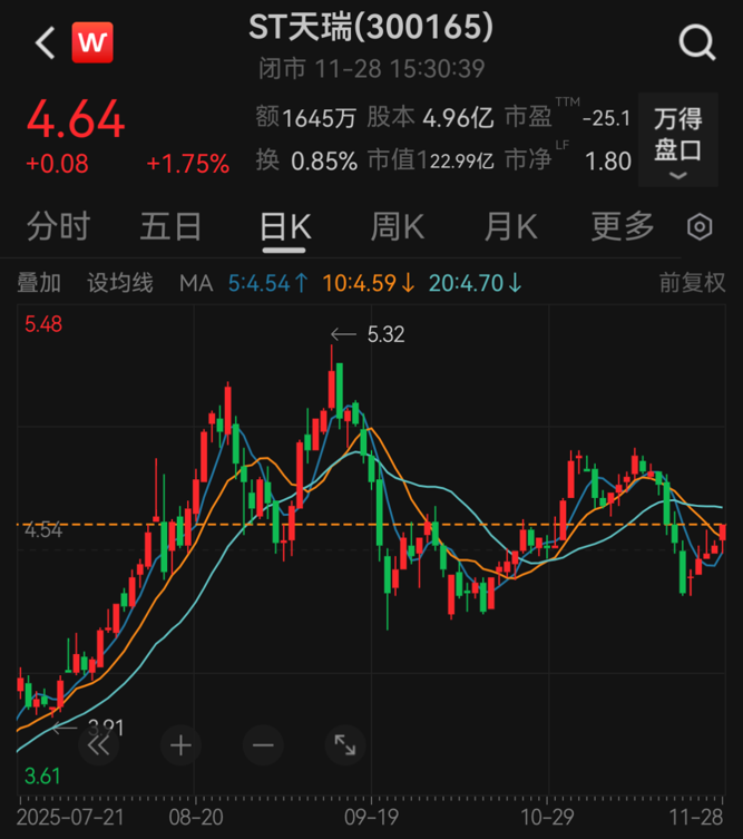 11月28日,ST天瑞股价以4.64元/股报收,最新市值为22.99亿元。