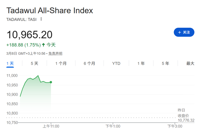 沙特基准股指上涨近2%,大多数成分股走高,其中能源股和材料股领涨。